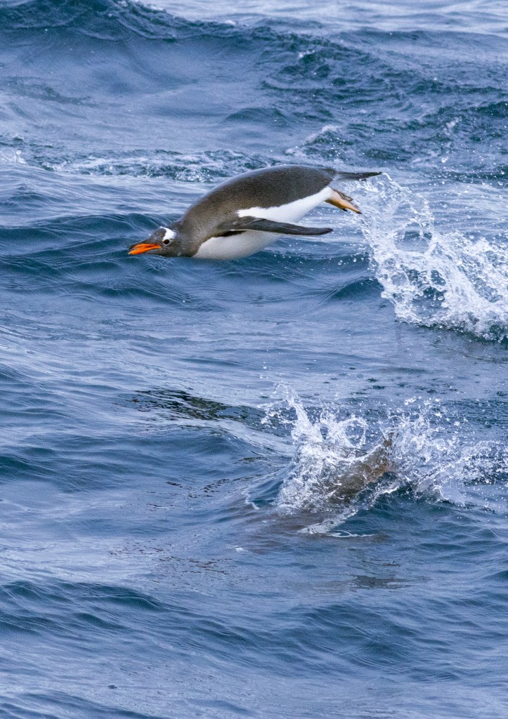 As we sailed away, I watched the sunset over the island as Gentoo and King Penguins porpoised all around the boat. I stood next to one of the marine technicians, Lauren, who went by the apt nickname “Bird”. We watched as the sun slipped behind the mountains, creating soft orange rings around each crooked peak. A few seabirds were still moving through towards their evening haunts, and I attempted to photograph them against the flaming sky. I turned to Bird for advice; in her time off the water, she was a bush pilot and photographer for National Geographic documentaries. She guided me as I adjusted my settings, right as a South Georgia Shag whipped by, silhouetted perfectly between the dark sea and clouds. As it got daylight and the last of the sun’s rays melted off the white snow, we set down our cameras and exchanged stories. Bird’s path to Antarctica was more intricate than my own, starting with a settled life in Idaho disrupted by a stint of homelessness and a new start chasing her childhood dream of a life at sea. Now we sat together on the cold metal deck of a ship 1,200 miles from the mainland, having just set foot on the silent shores of a remote island. The mountains faded away to the stern as the boat rocked, cruising away from the precipice of our foray ashore, our words falling away lost in the rumbling waves of the calling sea.